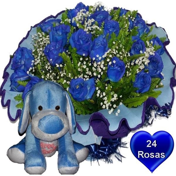 Buquê 24 Rosas Azuis + Cachorro Azul “Te Amo”
