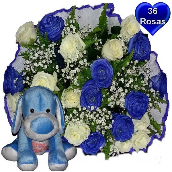 Buquê 36 rosas Azuis e Brancas + Cachorro Azul Te Amo