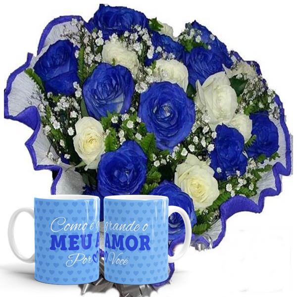 BUQUÊ COM 12 ROSAS AZUIS E BRANCAS+CANECA AZUL”COMO É GRANDE MEU AMOR”