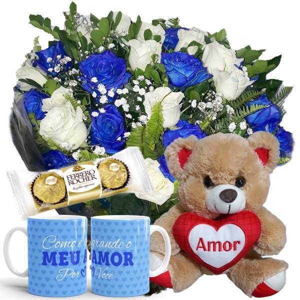 Buquê com 12 Rosas Azuis e Brancas+Chocolate 3un+Urso coração Amor 15cm+1Caneca Azul “Como é Grande o meu…”