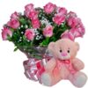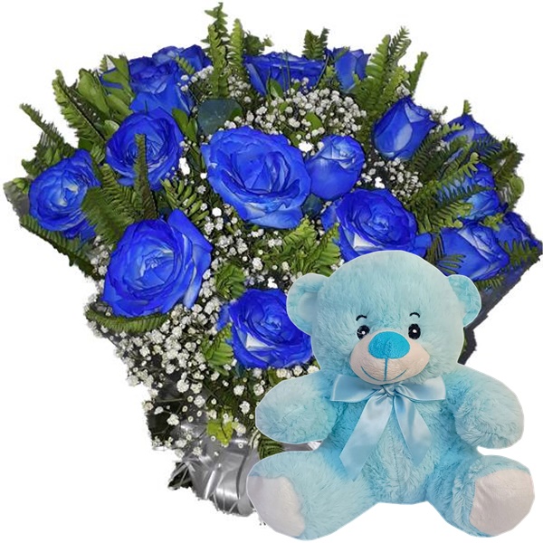 Buquê com 12 Rosas Azuis+Urso Pelúcia Azul 25cm