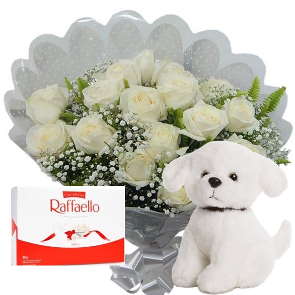 Buquê com 12 Rosas Brancas+Cachorrinho de Pelúcia 25cm+Chocolate Rafaello 9un