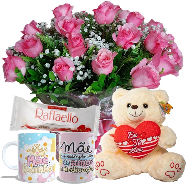 Buquê com 12 Rosas cor Rosa+Urso Pelúcia 30cm “Eu te amo”+Chocolate Rafaello 3un+1Caneca “Mãe Rainha”
