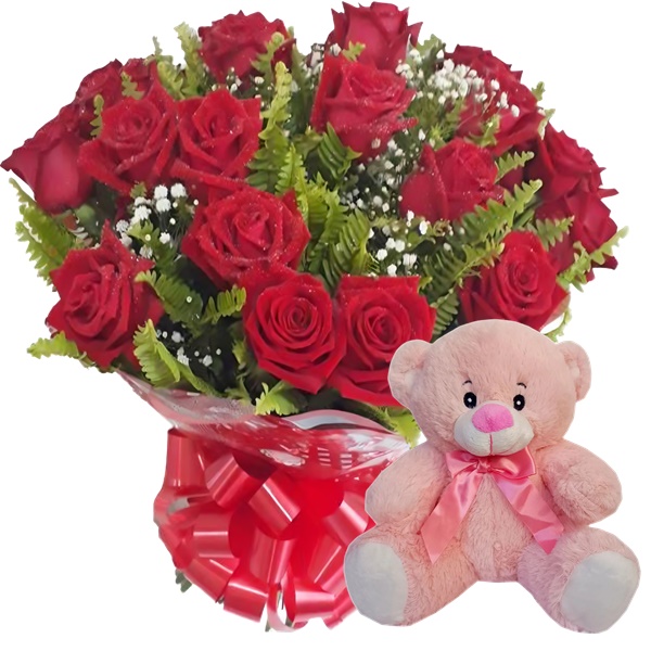 Buquê com 12 Rosas Vermelhas+Urso Pelúcia Rosa 25cm