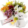 Cesta com Flores Campestres+Chocolate 6un+Urso Pelúcia Rosa 25cm