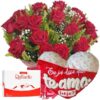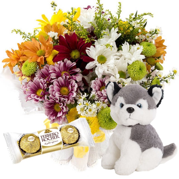 Mini buquê com Flores Campestres+Chocolate Ferrero 3un+Cachorrinho Pelúcia 25cm